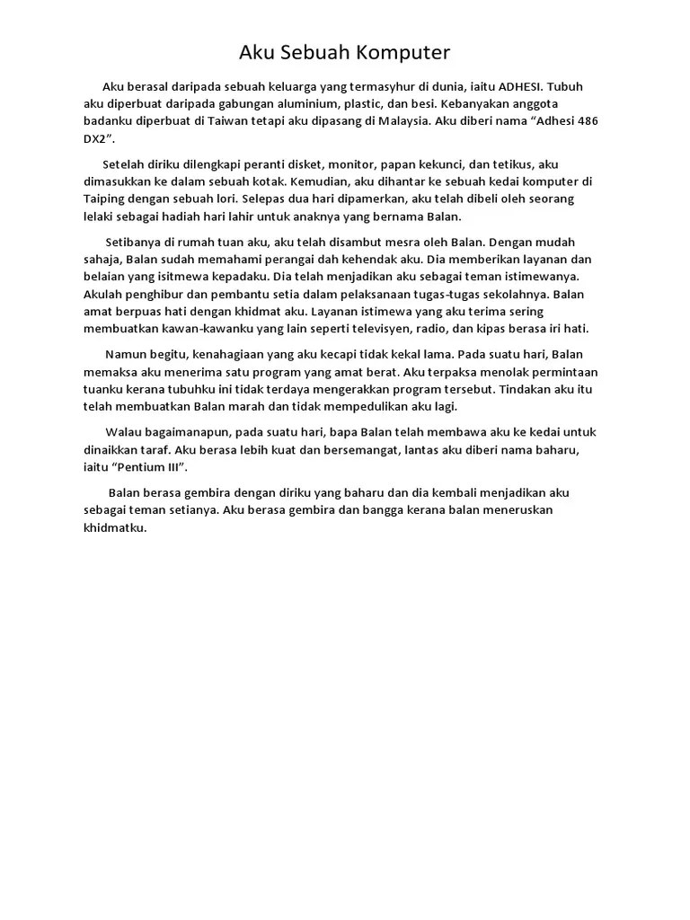 Aku diperbuat dan dipasang di jepun dengan menggunakan . Edutopia karangan aku sebuah komputer riba. Contoh karangan bahasa malaysia sk dan sjkc / tahun 4,5,6 upsr karangan jenis autobiografi 1 tulis sebuah karangan yang bertajuk " aku sebuah komputer". Aku dilahirkan di sebuah kilang elektrik yang terletak di johor baharu. Aku adalah sebuah komputer riba yang berjenama lenovo.